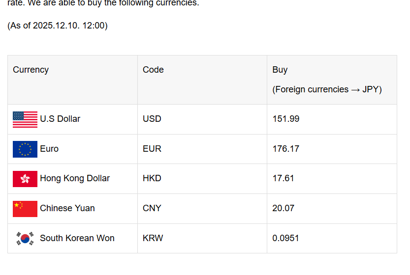 Today’s exchange rate. For foreign currency exchange, please visit “OSAKA-EXCHAGE.” You can make a reservation for currency exchange online. The weak yen has resulted in a good exchange rate!