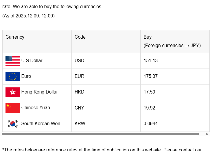 Please note that our currency exchange service requires a reservation. We do not accept same-day currency exchange. To ensure smooth service and availability, please make a reservation at least 3 business days before your visit.